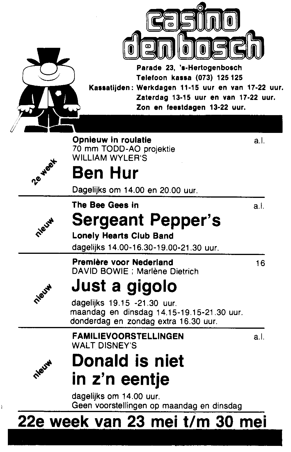 Voor de grote zaal toneelvoorstellingen werd in het bioscoop voorprogramma ook soms reclame gemaakt vanuit het theater.